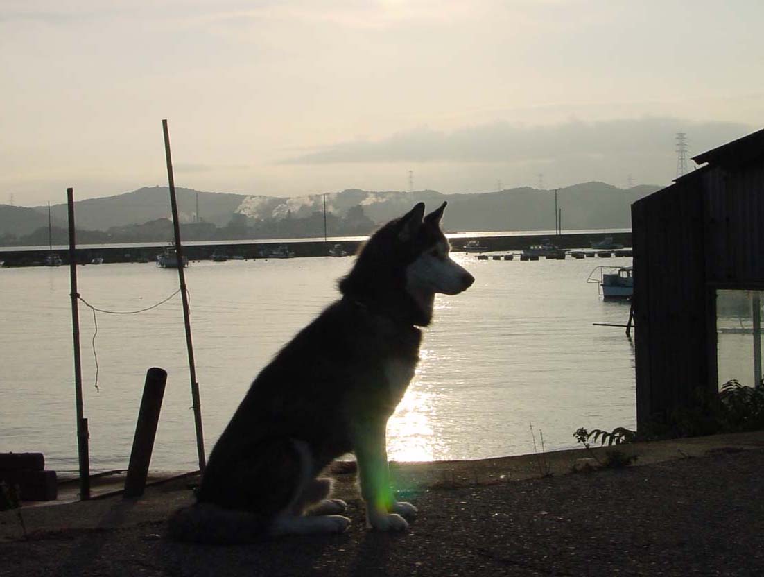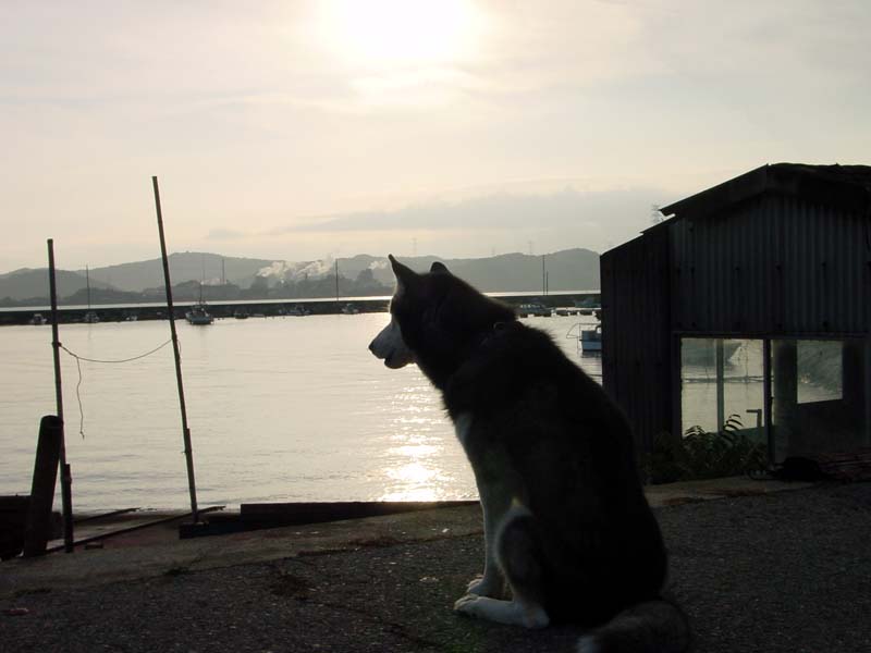 はるかに瀬戸内海に架かる橋の望める岡山の漁港の早朝。瀬戸の『海』の水に映る『逆光』を狙ってシャッターを押しましたが・・・・・