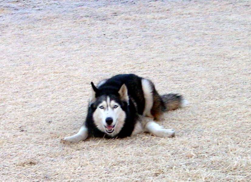 地面に伏せて「走ろうよ!」と誘うカイザー。