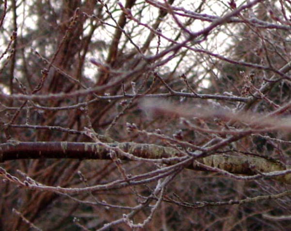 朝早かったので、オオムラサキつつじの葉に霜が降りていました。桜の芽も少し色付いてきたような・・・・